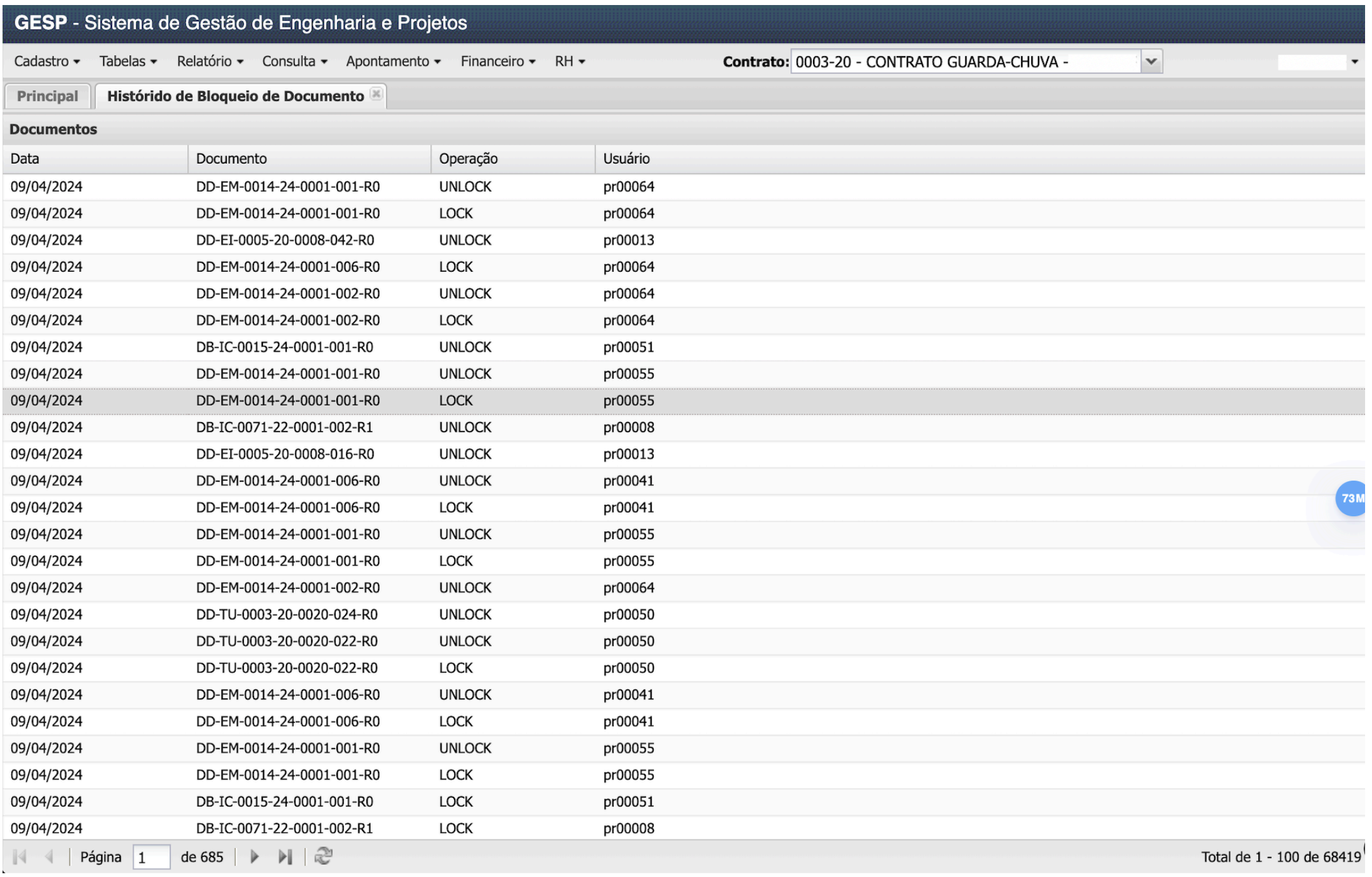 O módulo de Gestão de Produtividade do sistema permite o registro e acompanhamento detalhado da participação dos colaboradores na elaboração de documentos técnicos.