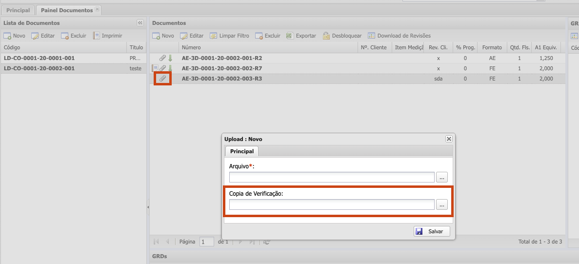 - O desenhista/projetista responsável deve realizar a cópia de verificação de cada documento e submetê-la no sistema.