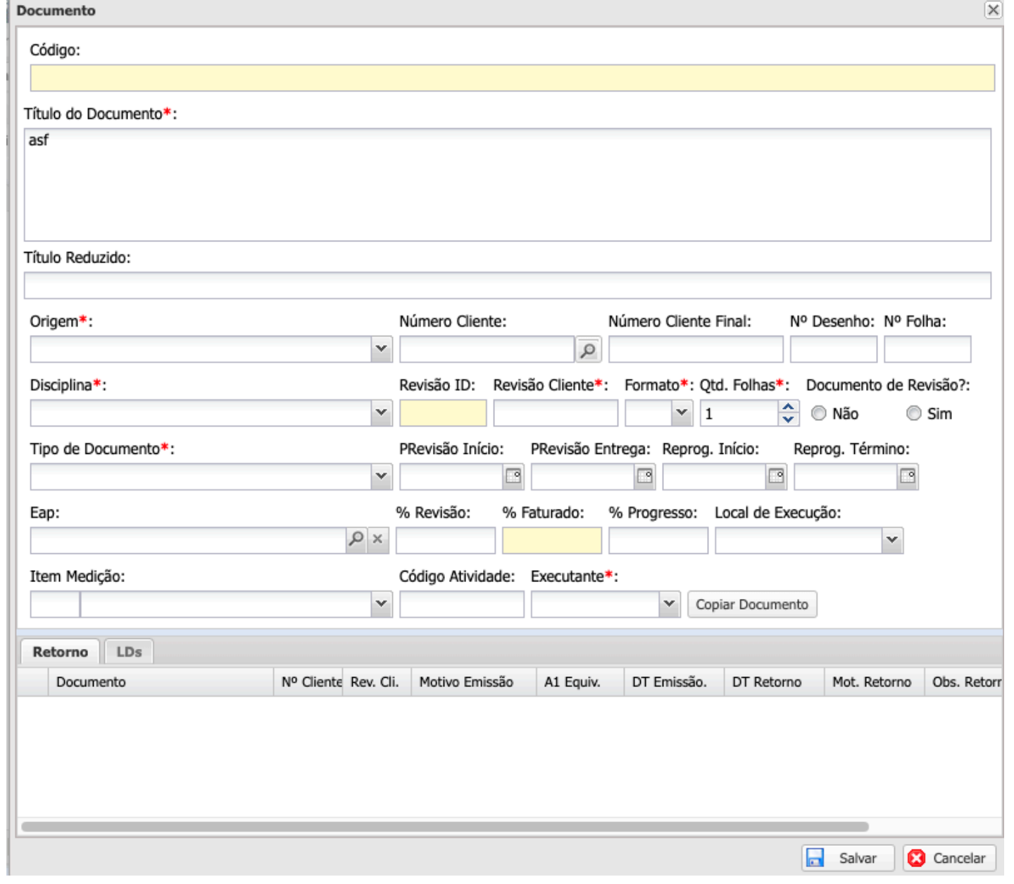 Será exibido o formulário para cadastrar o documento (* Os campos em amarelo são preenchidos pelo sistema.)
