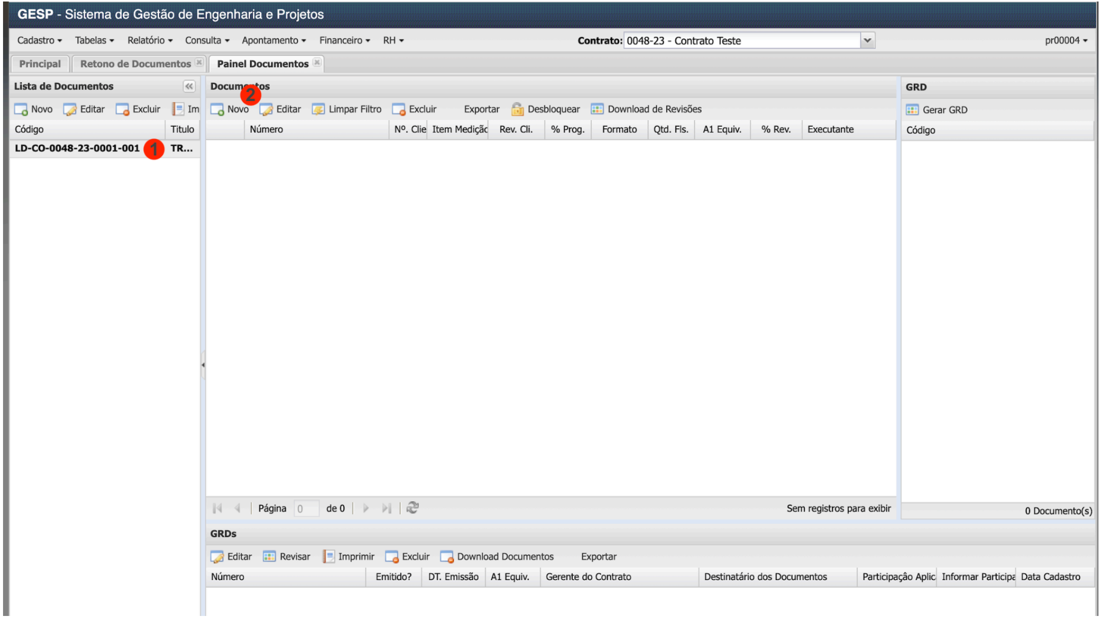 Um documento deve ser cadastrado dentro de uma LD, para cadastrar um documento tenha um contrato selecionado, clique no menu Cadastro -> LD / Documentos / GRD.