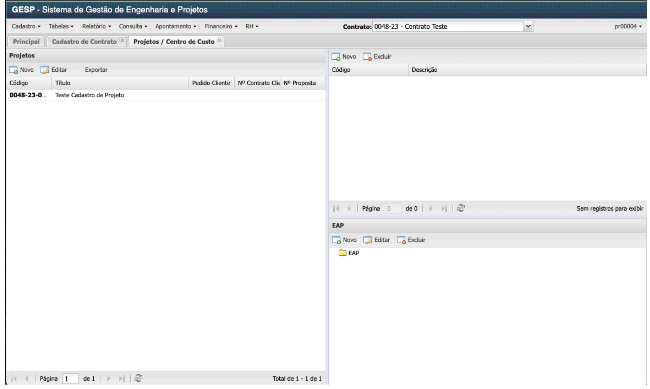 O projeto é a forma de formalizar parte todo o escopo alinhado com o cliente, registrando os dados necessários. Para cadastrarmos um projeto, devemos previamente ter o contrato cadastrado, com o contrato já cadastrado, selecione o contrato na aba barra superior do sistema.